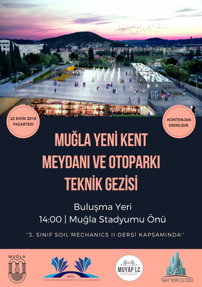 22 Ekim 2018 (Pazartesi) günü Soil Mechanics 2 dersi kapsamında Doktor Öğretim Üyesi Altuğ SAYGILI ile 3. sınıf öğrencileri için Muğla Yeni Kent Meydanı ve Otoparkı Teknik Gezisi düzenlenecektir. Katılamak isteyen öğrencilerin Çağdaş ESMER'e isimlerini yazdırması gerekmektedir.